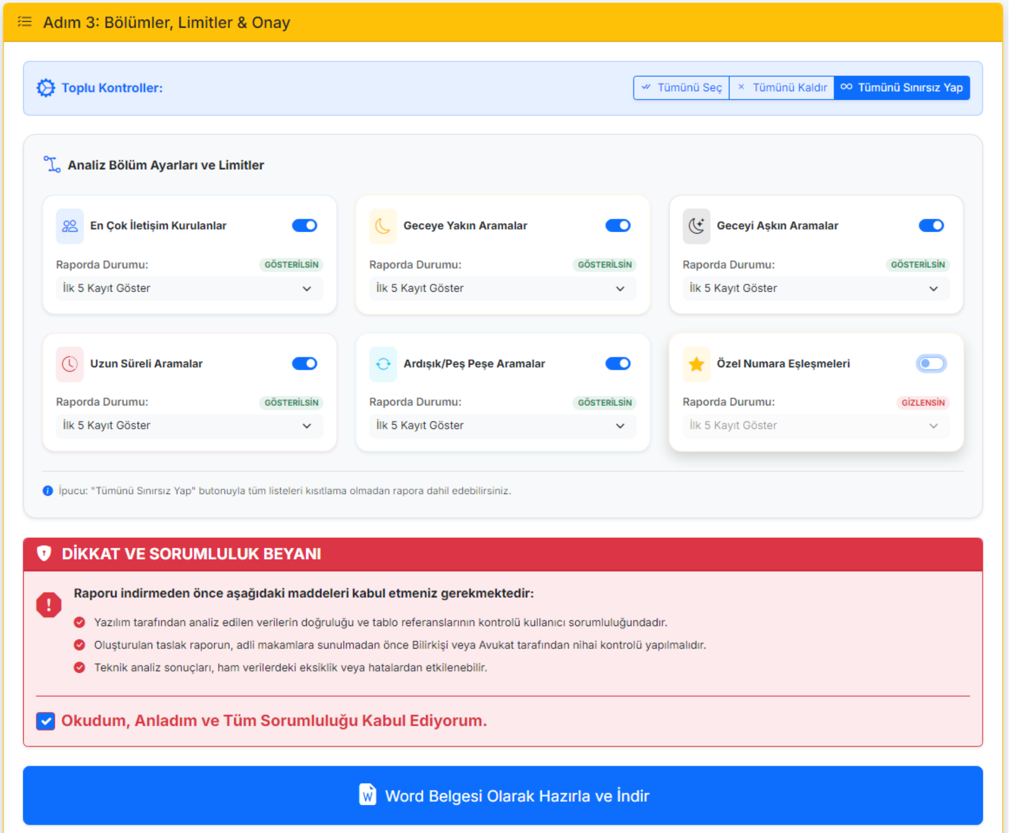 Operatörlerden gelen şifreli Excel ve PDF dosyalarını doğrudan sisteme yükleyin. Özel geliştirilmiş algoritma motoru, ham iletişim kayıtlarını saniyeler içinde bilirkişi incelemesine hazır hale getirir.